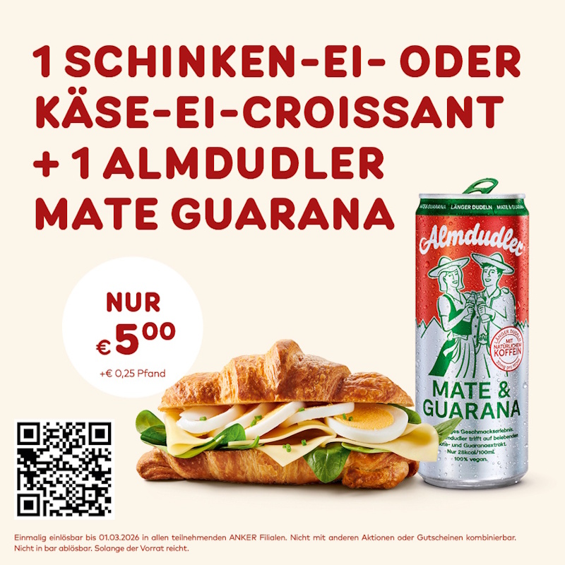 Wähle die zu dir passende Disziplin, kommentiere & gewinne! Die kreativsten Beiträge holen sich Gold, Silber und Bronze 🏆 Frühstücks-Rodeln Zwei Dinge, die du brauchst, um frisch & mit aufrechter Haltung in den Tag zu starten – und warum ohne eines davon alles schiefgeht. Koffein-Berg- und Talfahrt In einer Kurve elegant, in der nächsten schon full speed: Beschreibe deinen Tag mit ANKER & Almdudler Mate Guarana in 5 Worten. Wachheits-Sprint Welche Figur legst du zwischen E-Mail, Almdudler Mate Guarana und gefülltem Weckerl hin, wenn die Energie nachlässt? Bitte fülle mindestens eine Winter-Disziplin aus. Vorname E-Mail Ein Gutschein für alle! Als Goodie erhält jede:r Teilnehmer:in bei Absenden des Formulars automatisch einen Gutschein für 1 Schinken-Ei- oder Käse-Ei-Croissant + 1 Almdudler Mate Guarana (0,33l) zum Sonderpreis. So macht das Mitspielen doppelt Spaß! Ich stimme den Teilnahmebedingungen zu Absenden Teilnahmeschluss ist der 22.02.2026 Deine Daten sind sicher! Wir verwenden deine E-Mail-Adresse nur zur Abwicklung des Gewinnspiels und zur Zusendung des Gutscheins.